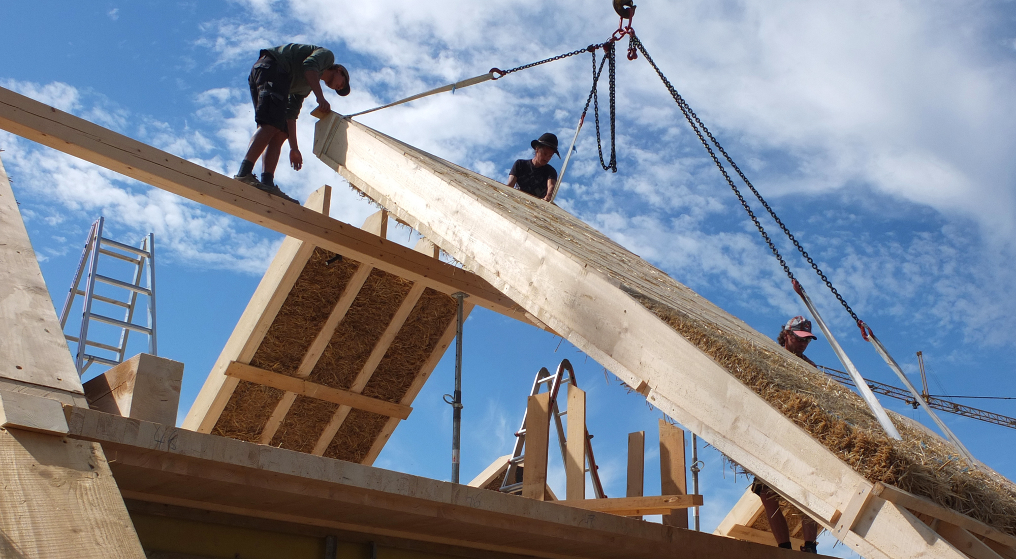Unsere Arbeitsweisen und Methoden orientieren sich an ökologischen und sozialen Werten. So berücksichtigen wir u.a. die Herstellungsenergie der Baustoffe. Uns ist wichtig, dass der ökologische Fußabdruck auch in der Baubranche an Bedeutung gewinnt. Wir konzentrieren uns auf einfache, nachhaltige und ökologische Methoden. In unserer Bauweise fertigen wir Halbfertigelemente aus Holzständern, in die Strohballen eingepresst sind und die bereits mit der ersten Lage Lehmputz verputzt sind. Dieser Vorfertigungsgrad trägt dazu bei, die Bauzeiten zu reduzieren. In der Kombination mit Lehmputz erreicht die Strohballenwand einen sehr hohen Feuerwiderstand und funktioniert feuchteschutztechnisch, schallschutztechnisch und wärmeschutztechnisch hervorragend. Durch die Fähigkeit des Lehms, sehr gut Luftfeuchtigkeitsschwankungen auszugleichen, ergibt sich ein besonders gesundes Raumklima. Das Stroh steht als nachwachsender Rohstoff von den uns umgebenden Feldern für die Dämmung und als Putzträger zur Verfügung. Das Holz, ebenfalls ein sehr hochwertiger, nachwachsender und wenig bearbeiteter Rohstoff, garantiert die Stabilität des Baus. Es kommt auch aus der nahen Region. Der Lehm stammt von der Firma LEVITA aus Malching und ist eine extrem ökologische und qualitativ hochwertige Lösung für die Verputzarbeiten. Damit ist Strohballenbau eine sehr nachhaltige, ökologische und Ressourcen sparende Bauweise mit weniger klimaschädlichen Emissionen.